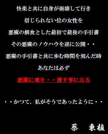 ■悪魔の手引書■ 女性を瞬間であなたの「もの」にする悪魔のトリック 絶対に逃れる事が出来ない罠とは■ The Bible of the devil 詳しく、知りたい方はこちら 本来私はこのノウハウを公開するつもりはありませんでした、 何故なら私が犯した罪を全部曝け出す事になるからで 悪魔の手引書は超恋愛に苦手だった私がどうやって数多くの女性を誘導し 快楽の渦に落としていったのかその詳細を全て纏めてあります 苦痛から逃れる為に、様々なスキルを覚え、世界で活躍する先生方から教えを請い 絶大な力を手に入れ心理学と催眠、NLP、気功、感情のバランス、精神療法を更に取り込み、 そのノウハウを完全な女性誘導パターンに変えてしまった 想像もつかない女性の誘導方法とは・・・ 許して下さい この出会いが、あなたの「すぐ未来の人生を狂わせる事に」なるかもしれません。 何も欲がなければ大事には至る事がありませんが、あなたの脳裏に次々と女性が浮かんで 来るのであれば、あなたの人格は悪魔にもなりうるでしょう・・・・・ 詳しく、知りたい方はこちら 詳しく、知りたい方はこちら PR |